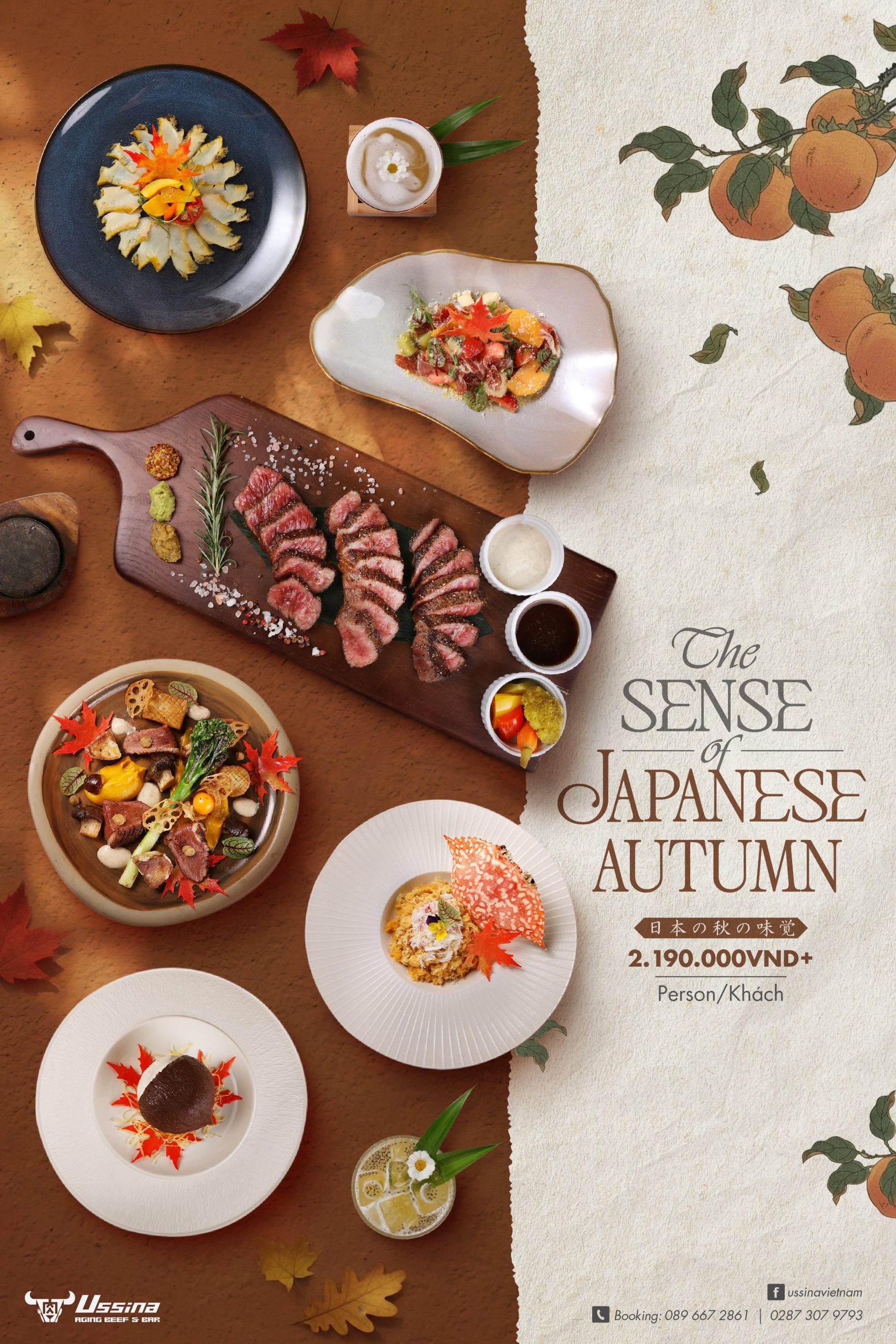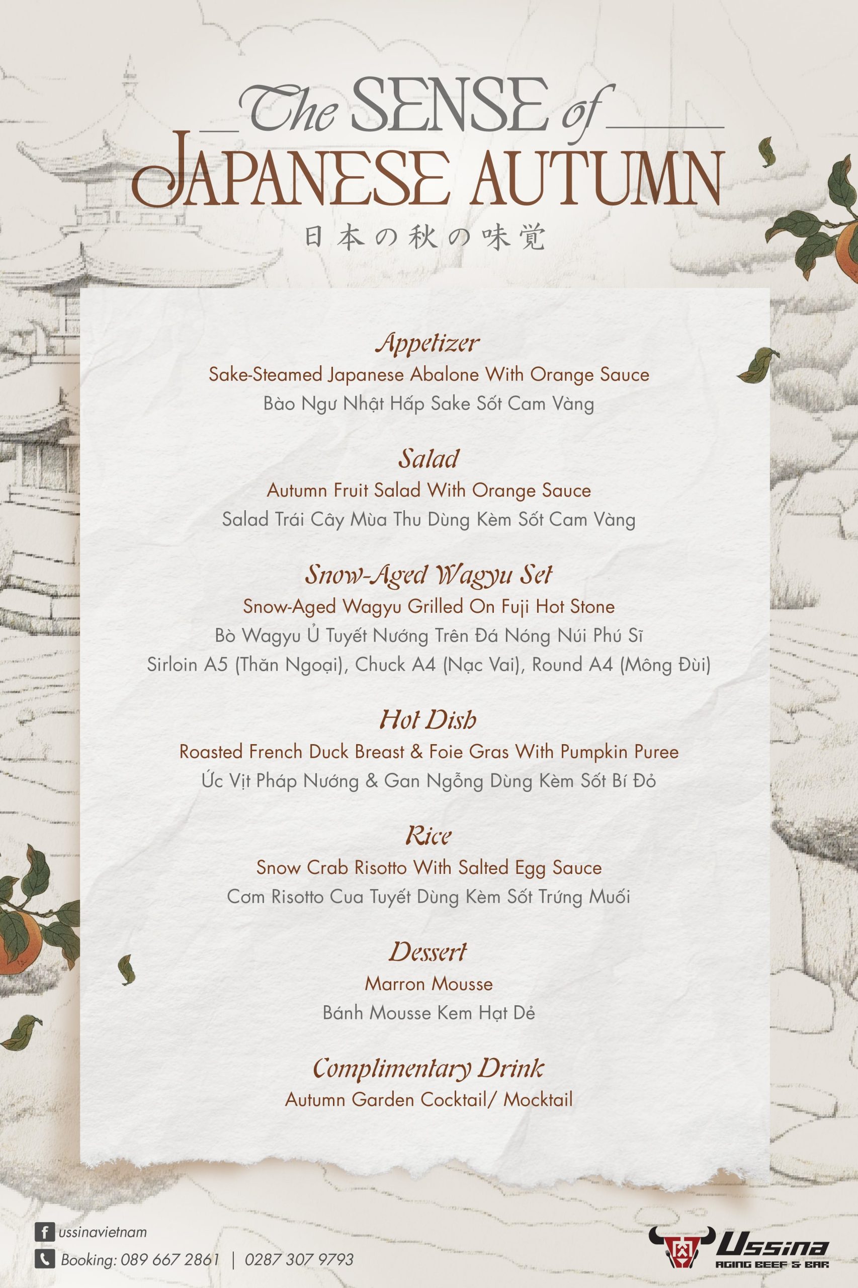 Mùa thu năm nay, Ussina sẽ chiêu đãi thực khách với The Sense of Japanese Autumn đầy tinh tế và khác biệt – set menu đầu tiên mang đến trải nghiệm song hành hai cấp độ Bò Wagyu Ủ Tuyết A4 & A5, kết hợp cùng các nguyên liệu đặc trưng mùa thu được người Nhật sử dụng như: bí ngô, hạt dẻ, bào ngư,…