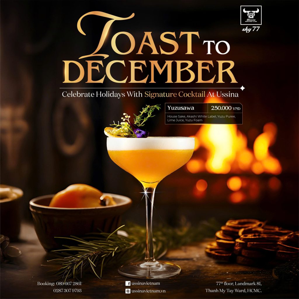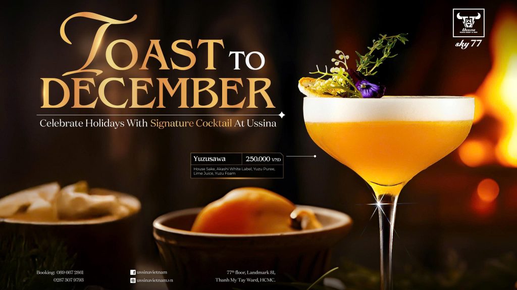 Để làm trọn vẹn không khí hân hoan và ấm cúng của mùa lễ hội cuối năm, Ussina Sky 77 đã dày công sáng tạo và cho ra mắt bộ sưu tập thức uống độc quyền, nơi mỗi ly Cocktail không chỉ là một thức uống mà còn là một câu chuyện hương vị. Với sự kết hợp tinh tế giữa nguyên liệu truyền thống Nhật Bản và kỹ thuật pha chế hiện đại, bộ sưu tập này mang đến nhiều lựa chọn sáng tạo, phù hợp với mọi sở thích và mọi khoảnh khắc trong bữa tiệc sang trọng của bạn.