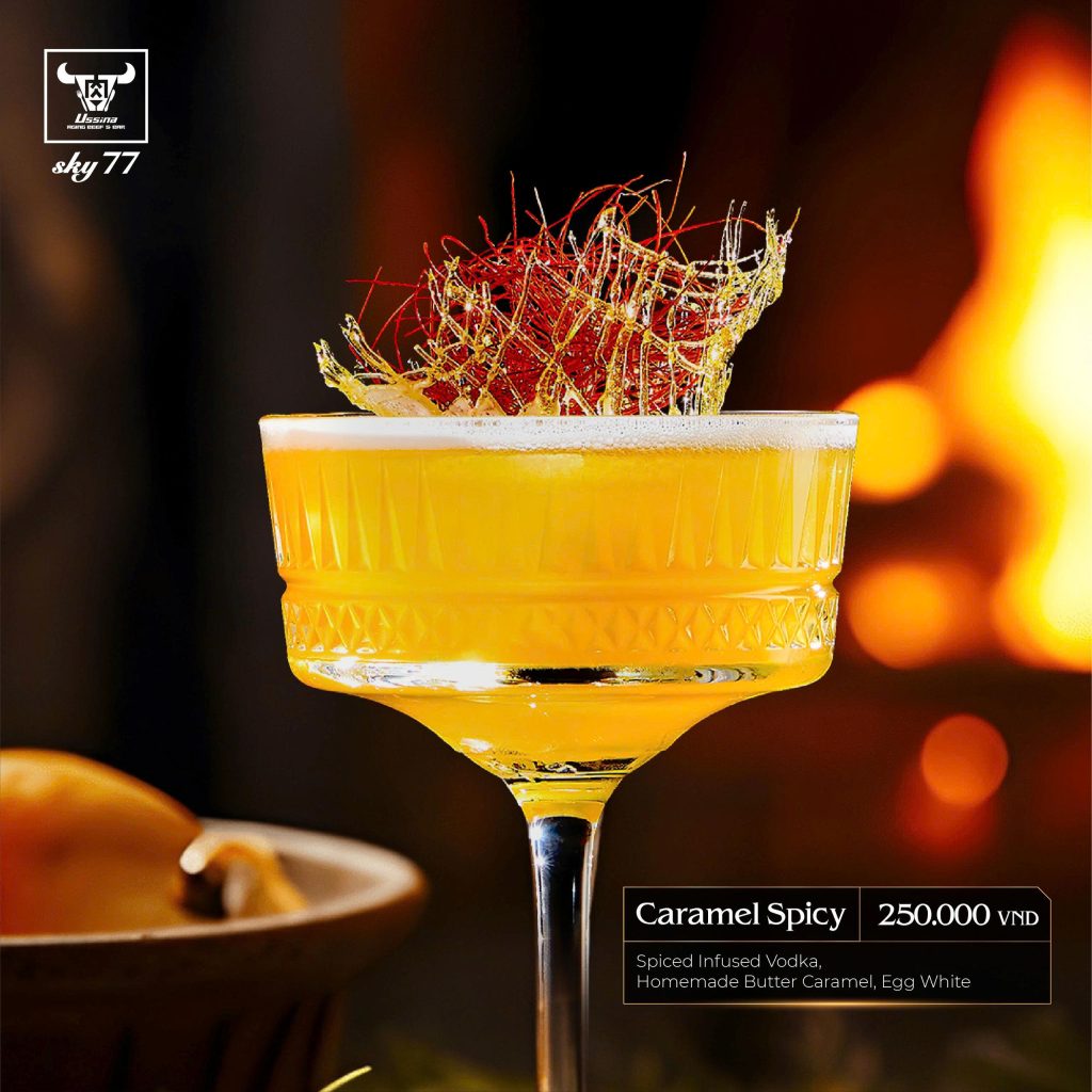 Caramel Spicy Cocktail làm bùng nổ hương vị lễ hội với sự pha trộn giữa Vodka được ủ gia vị (Spiced), Caramel bơ tự làm ngọt béo, và chút cay nhẹ ở hậu vị. Lòng trắng trứng tạo ra lớp bọt kem mịn màng, hấp dẫn. Phù hợp dùng sau bữa ăn hoặc như một món tráng miệng Cocktail, mang lại cảm giác ấm cúng, đậm chất Giáng Sinh và năm mới.