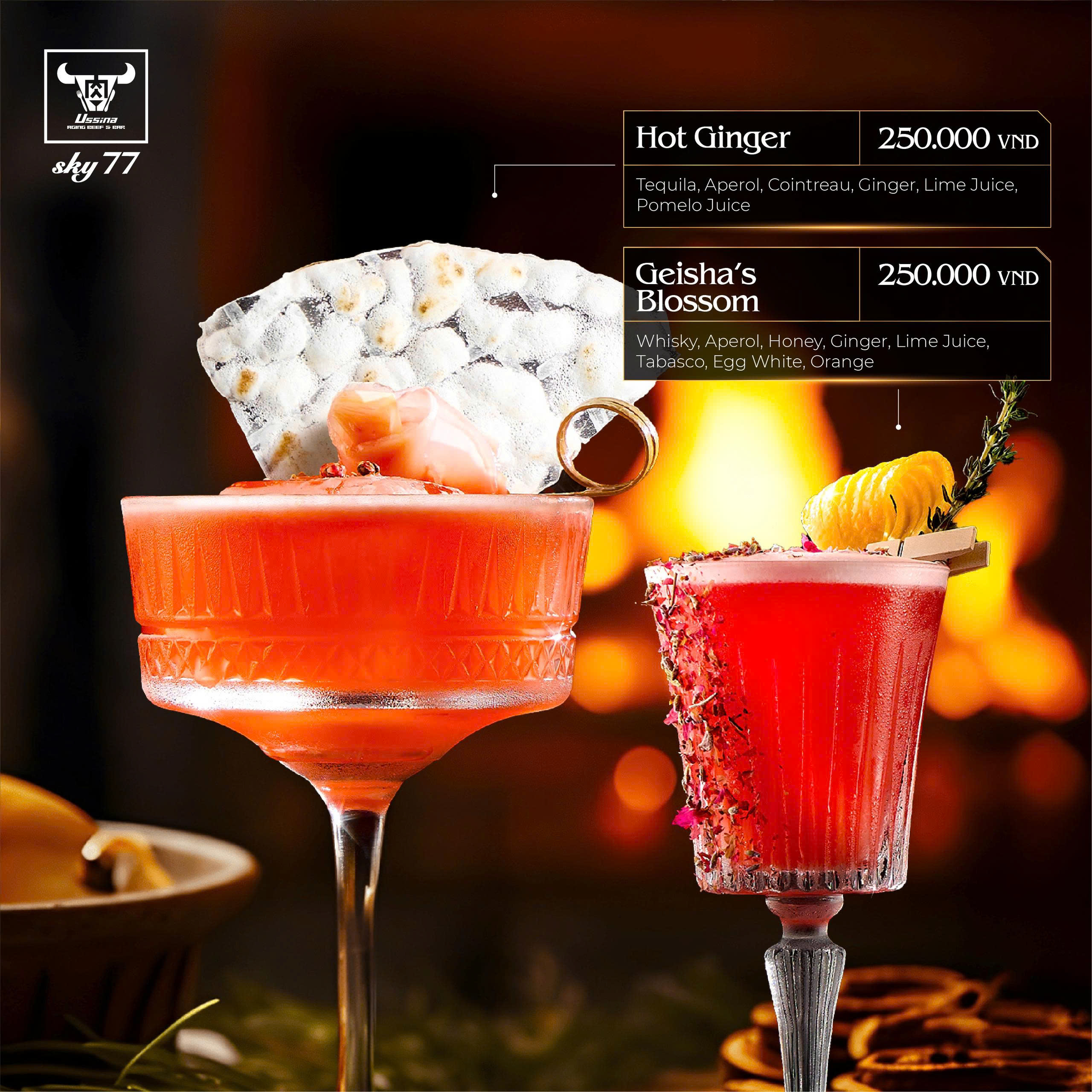 Để làm trọn vẹn không khí hân hoan và ấm cúng của mùa lễ hội cuối năm, Ussina Sky 77 đã dày công sáng tạo và cho ra mắt bộ sưu tập thức uống độc quyền, nơi mỗi ly Cocktail không chỉ là một thức uống mà còn là một câu chuyện hương vị. Với sự kết hợp tinh tế giữa nguyên liệu truyền thống Nhật Bản và kỹ thuật pha chế hiện đại, bộ sưu tập này mang đến nhiều lựa chọn sáng tạo, phù hợp với mọi sở thích và mọi khoảnh khắc trong bữa tiệc sang trọng của bạn.