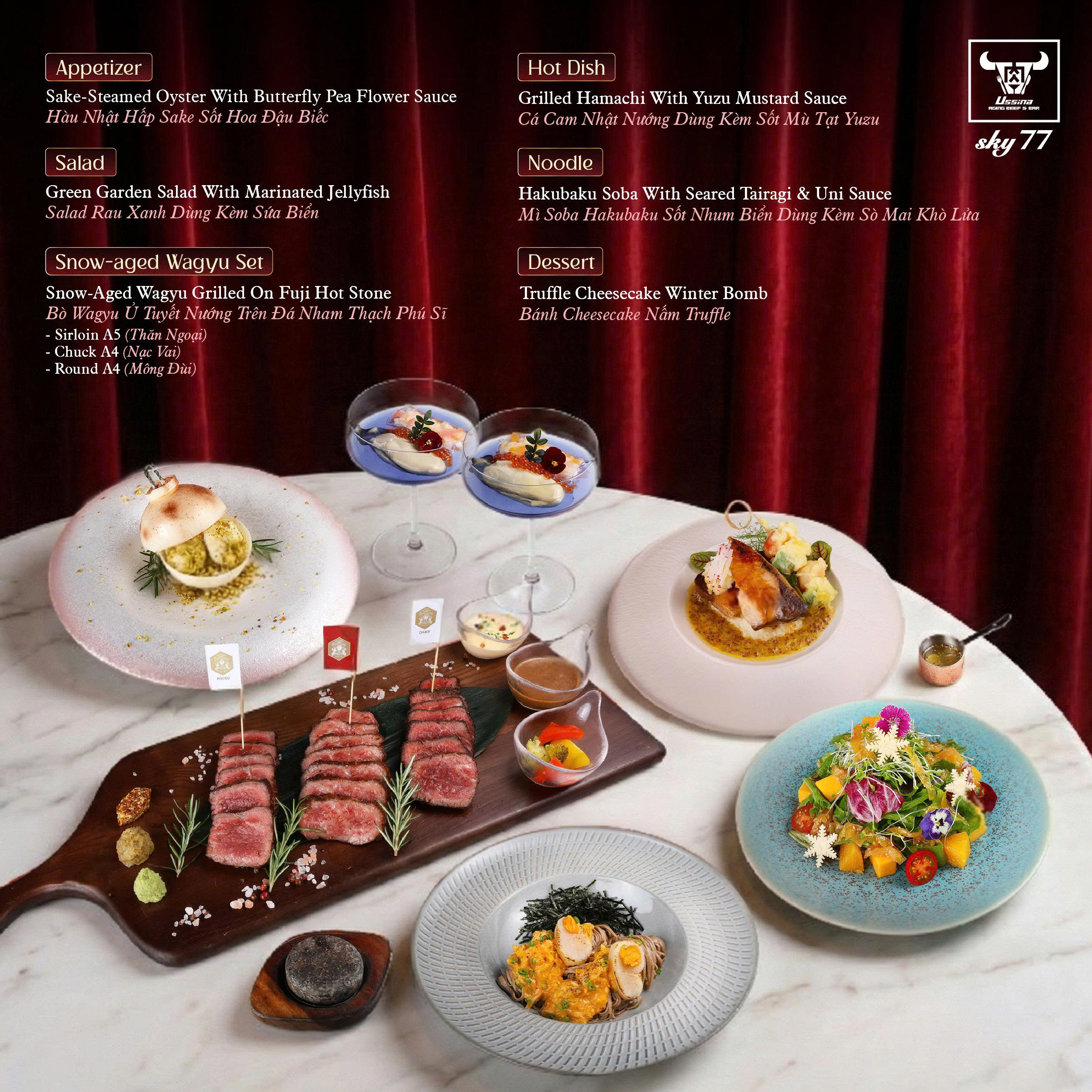 - Món chính: Bò Wagyu Ủ Tuyết Nướng Trên Đá Nham Thạch Núi Phú Sĩ (bao gồm 3 phần Thăn Ngoại A5, Nạc Vai A4 và Mông Đùi A4).
