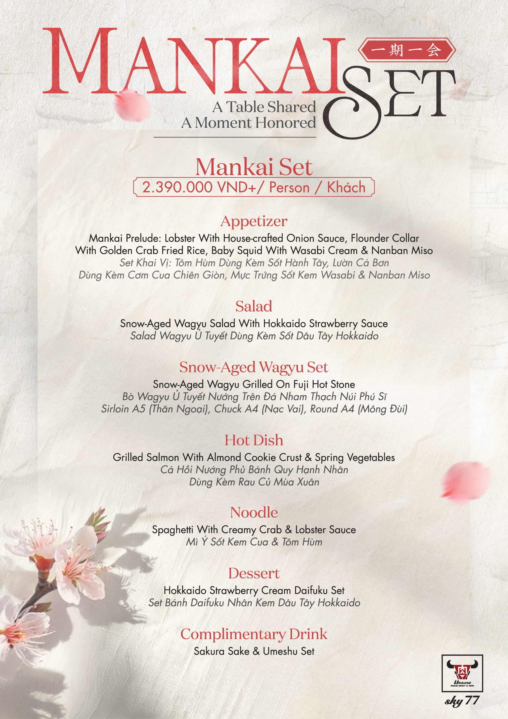 Với mức giá 2.390.000+ VNĐ/khách, Mankai set sẽ dẫn dắt vị giác của bạn qua những nguyên liệu đặc trưng mùa xuân Nhật Bản, từ dư vị đại dương của tôm hùm, cua tuyết, mực trứng,… đến vị ngọt lành từ măng tây hay cà chua Hokkaido mọng nước. Đặc biệt là sự xuất hiện của Bò Wagyu Ủ Tuyết thượng hạng mang tính biểu tượng của Ussina.