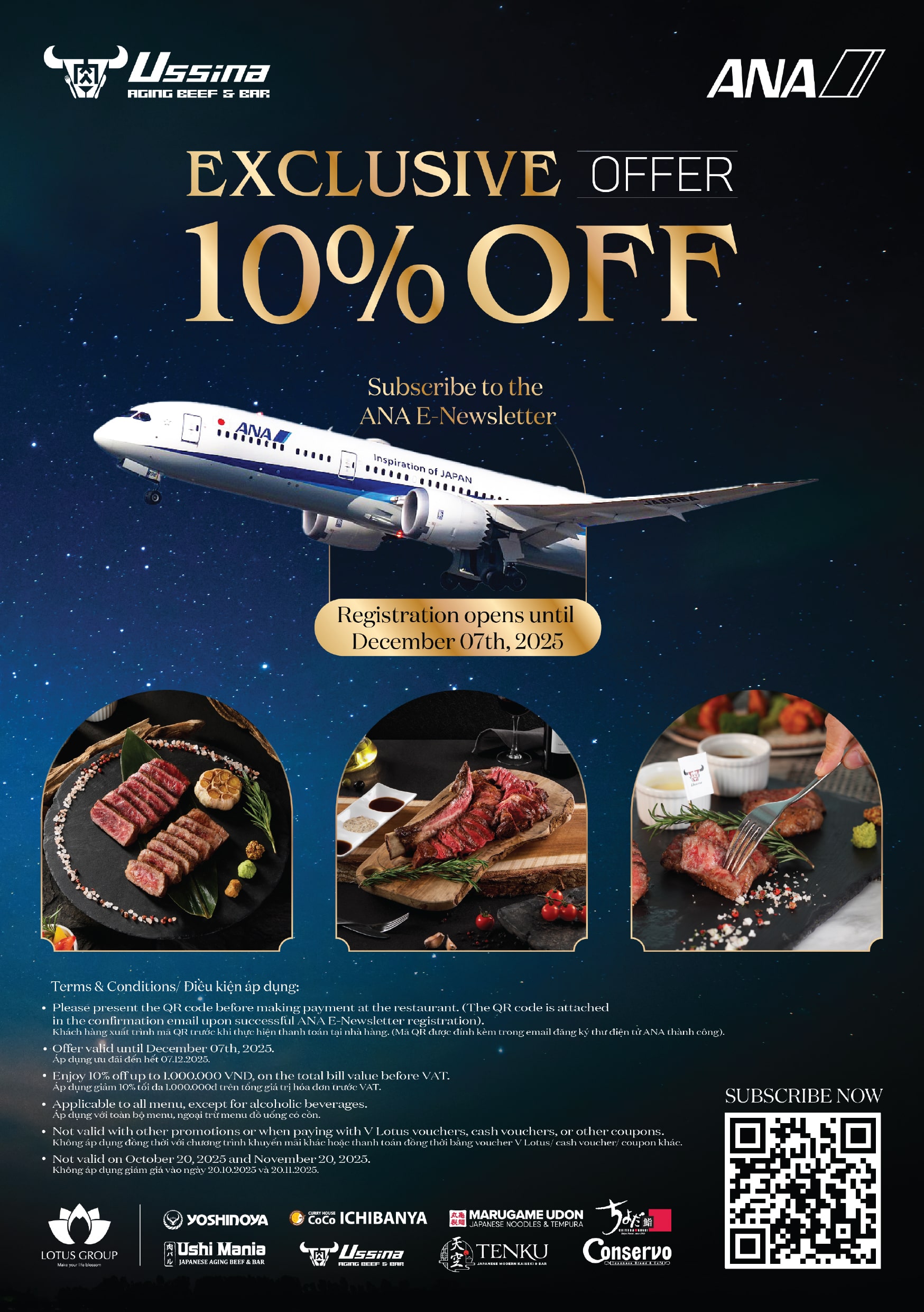 – Enjoy a 10% discount, up to 1,000,000 VND (before VAT), on the total bill when dining at Ussina. Guests are required to present the QR code before making payment at the restaurant.